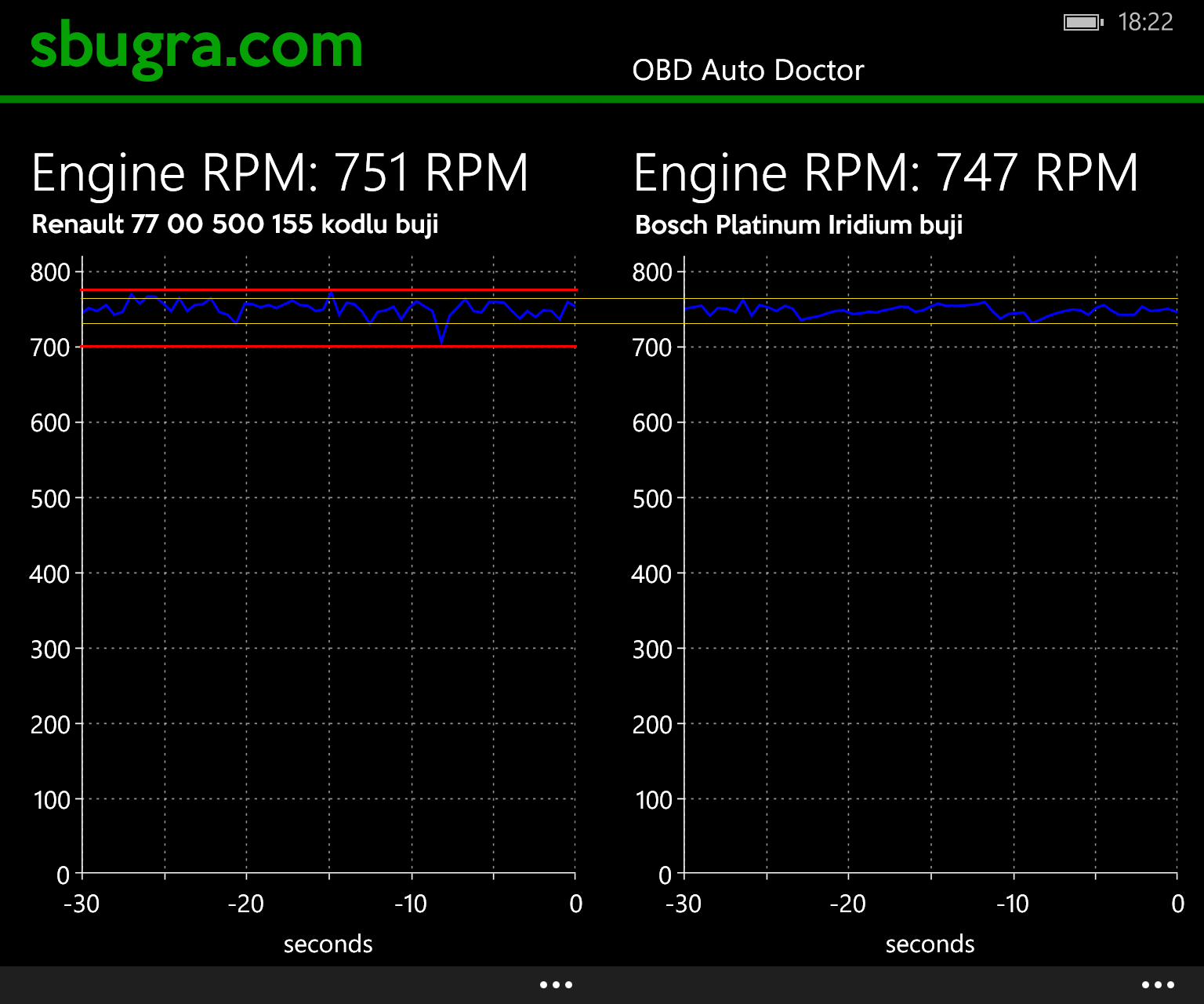 Aracım 2011 model Renault Megane 3 1.6 cc 16v Dynamique 4 yaşını doldurdu ve 80.000 km sınırına dayandı. Ağır bakımlarını yaptırmadan önce servisin taktığı bujileri değilde başka buji kullanmaya karar verdim. İnternette çokça araştırma yapıp elimden geldiğince çok kişiye danıştım. Aracımı çoğunlukla LPG ile kullanıyor olmamdan dolayı Bosch Platinum Iridium bujilerine karar kıldım. Araştırma yaparken dikkatimi çeken bir husuta bu bujileri kullananların iyi/kötü bolca yorumlarının olmasına rağmen araca ne kadar yarar/zarar kattığına dair matematiksel bir veri veya görsel grafik bulunmuyordu. Bende bizim araçlar için bir dizi test yapıp OBD2 protokolü ile elde ettiğim verileri karşılaştırmaya karar verdim. Bunlardan ilki aracımın üzerinde bulunan Renault’un 77 00 500 155 ürün kodlu standart eski bujilerim ile yeni taktırdığım Bosch Platinum Iridium bujilerin rölantide motorun çalışmasına etkisi üzerine oldu. Bu verileri araç LPG ile çalışırken kayıt altına aldığımıda unutmadan belirteyim. Buji değişim öncesi ve sonrası verileri yan yana getirdiğimde şu grafik ortaya çıktı;